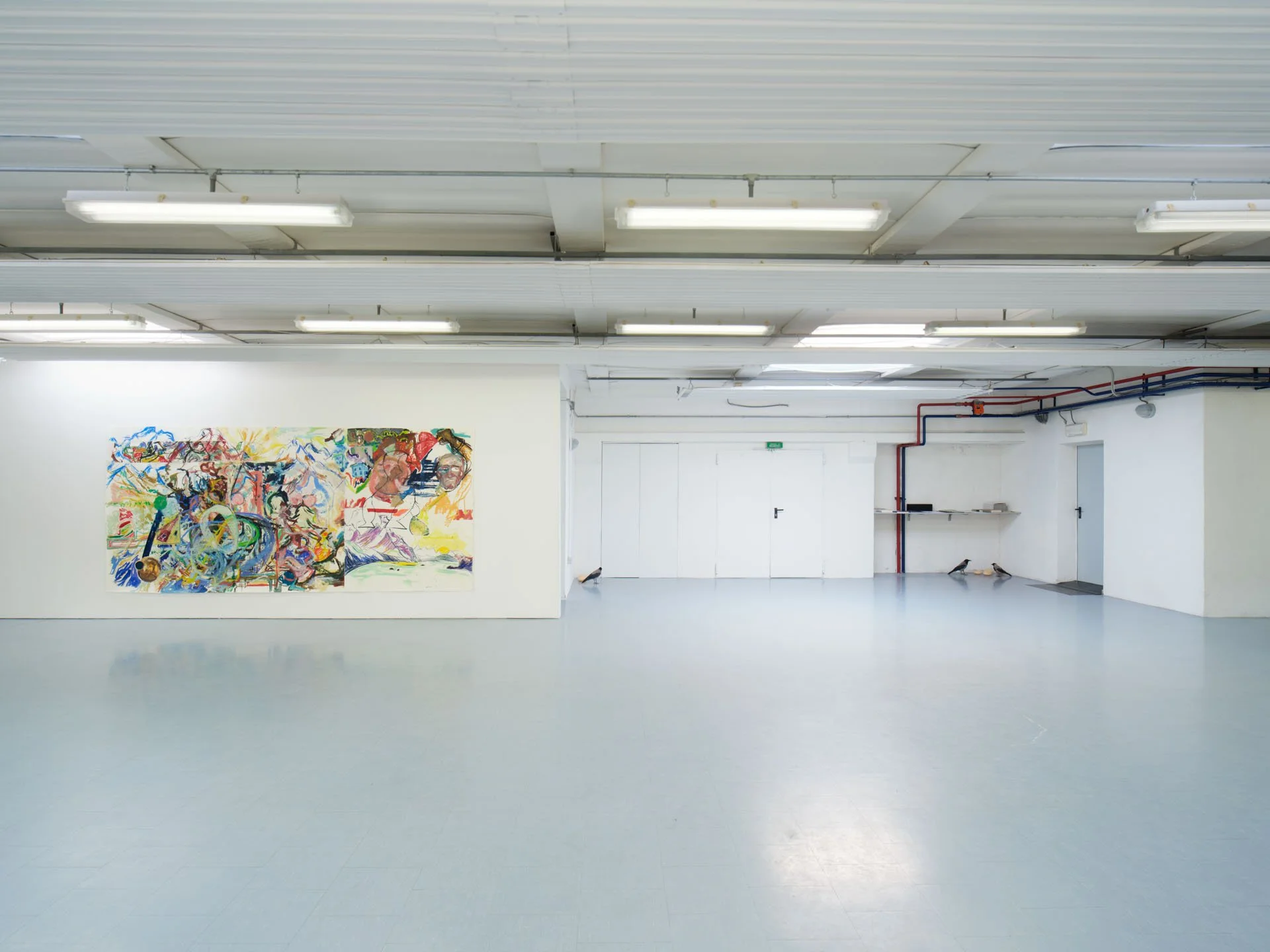 In the solo exhibition Sinossi (bon voyage) at Colli Independent Art Space, Rome, there is a canvas too. As with paper, canvas imposes its texture, it is thick jute, it affirms to be canvas, stretcher, object – perhaps still an alien presence, more of a sort of ‘Where is Wally?’. The surface is traversed by a black trajectory, acrylic and vinyl glue. It looks nonsense, though it is a mimetic reconstruction of the traces of glue left after removing billboards, posters and illegal signs seen around town. It is not just yet another reference to paper. Nor does it simply stand for a pictorial zeroing, a repression of the image – one immediately thinks of such artists as Mario Schifano and Mimmo Rotella. It is instead one of the escamotages to bite the tail of the dragon, that denotes an exhibition with no easy escape if not from a series of clichés on painting and its perception – those standards one usually clings to in order to try to understand and explain it. Five years after his last solo, the selection of large papers, the artist’s signature work, makes it clear that Pesce Khete’s intention is to dispel any possible doubt on what they seem and are. They are not expressionists but they search for expression, testing the notion of style more decisively – they are attempts, variations rather than stylistic experimentations. Style is in the continuous lengthening and narrowing the figural distances among pieces made either in the same period or in different years, for example, Untitled (2019) and Senza Titolo (O Istruzioni n.2) of 2017. The former seems convoluted but it is based on a solid composition (see the movement of the profiles of the heads and the limbs); the latter, at first calculated and essential, is instead deliberately casual. Order/chaos, composition/casualness are just two of the polarities that serve to focus the attention on painting qualities, the semantic and metaphoric shifts that, each time, mess up such general ideas as figuration and abstraction, rigour and spontaneity. In their brusqueness, the four smaller works on view, mixed media on paper and vellum, exacerbate this metamorphic process at the expense of a certain narrative taste that derives from the artist’s long-term acquaintance with vignettes, comics and illustration. Tape, in this respect, finds a more explicit collocation. In the exhibited works, it takes on a variety of tropes: it is necessary support, framing device, signifier, even absence when the eye continues to see it in the empty areas as in Untitled (2018-2019). Mainly, it reminds of a physical storyboard in its role of conjunction, partition and multiplication of image levels, breaking, syncopating or interrupting the narrative tension. The tangles of figures and objects involve themes like everyday survival, construction activities, daily accidents and rituals. Hands and eyes recur as if evoking sensory perception. Phallic or vaginal shapes, anatomical allusions to lips or anuses subtend sexual intercourses. Though, everything is overlapped, stuck up, centrifuged in a wild and automatist anti-narrative that eventually resolves in the “picture-within-picture” dynamics. One might seize a logic, thinking of a lineage that goes through Munch’s variations on the theme and Picabia’s transparencies, Albert Ohelen’s collisions and Ansel Krut’s art-historical pulping. Yet his remain indecipherable visions, before which the prevailing feeling is to be mired in a magmatic and vernacular world outside, identifying its indomitable and unexpected flux with the unattainability of painting. The interweaving of images and pictorial means, of events and the studio, the life pulse, distinguishes these works from a lingua franca spoken by much international painting that aims at an escapist visionariness, dense with erudite quotations and highly accomplished aesthetic expectations. In Pesce Khete’s, we are in a seamless, unsolvable territory of non-hierarchical observations, unconscious associations and conscious analogies between “the street” and “the studio”. And when the street enters, disseminates and stratifies in the studio so viscerally, the rubber and pencil shavings left in a work say the same things as the depiction of what looks like a tumble down the stairs.