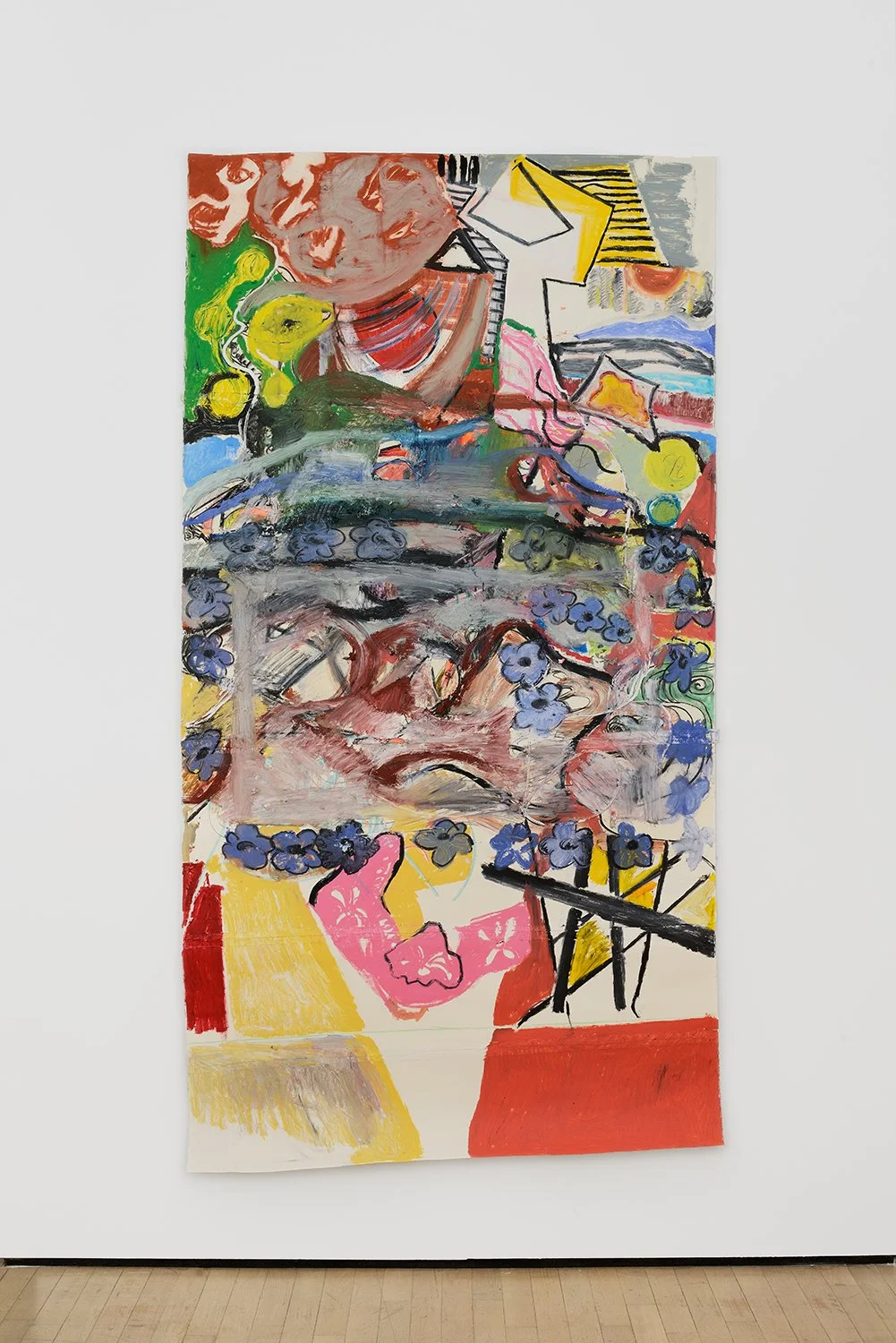 In the solo exhibition Sinossi (bon voyage) at Colli Independent Art Space, Rome, there is a canvas too. As with paper, canvas imposes its texture, it is thick jute, it affirms to be canvas, stretcher, object – perhaps still an alien presence, more of a sort of ‘Where is Wally?’. The surface is traversed by a black trajectory, acrylic and vinyl glue. It looks nonsense, though it is a mimetic reconstruction of the traces of glue left after removing billboards, posters and illegal signs seen around town. It is not just yet another reference to paper. Nor does it simply stand for a pictorial zeroing, a repression of the image – one immediately thinks of such artists as Mario Schifano and Mimmo Rotella. It is instead one of the escamotages to bite the tail of the dragon, that denotes an exhibition with no easy escape if not from a series of clichés on painting and its perception – those standards one usually clings to in order to try to understand and explain it. Five years after his last solo, the selection of large papers, the artist’s signature work, makes it clear that Pesce Khete’s intention is to dispel any possible doubt on what they seem and are. They are not expressionists but they search for expression, testing the notion of style more decisively – they are attempts, variations rather than stylistic experimentations. Style is in the continuous lengthening and narrowing the figural distances among pieces made either in the same period or in different years, for example, Untitled (2019) and Senza Titolo (O Istruzioni n.2) of 2017. The former seems convoluted but it is based on a solid composition (see the movement of the profiles of the heads and the limbs); the latter, at first calculated and essential, is instead deliberately casual. Order/chaos, composition/casualness are just two of the polarities that serve to focus the attention on painting qualities, the semantic and metaphoric shifts that, each time, mess up such general ideas as figuration and abstraction, rigour and spontaneity. In their brusqueness, the four smaller works on view, mixed media on paper and vellum, exacerbate this metamorphic process at the expense of a certain narrative taste that derives from the artist’s long-term acquaintance with vignettes, comics and illustration. Tape, in this respect, finds a more explicit collocation. In the exhibited works, it takes on a variety of tropes: it is necessary support, framing device, signifier, even absence when the eye continues to see it in the empty areas as in Untitled (2018-2019). Mainly, it reminds of a physical storyboard in its role of conjunction, partition and multiplication of image levels, breaking, syncopating or interrupting the narrative tension. The tangles of figures and objects involve themes like everyday survival, construction activities, daily accidents and rituals. Hands and eyes recur as if evoking sensory perception. Phallic or vaginal shapes, anatomical allusions to lips or anuses subtend sexual intercourses. Though, everything is overlapped, stuck up, centrifuged in a wild and automatist anti-narrative that eventually resolves in the “picture-within-picture” dynamics. One might seize a logic, thinking of a lineage that goes through Munch’s variations on the theme and Picabia’s transparencies, Albert Ohelen’s collisions and Ansel Krut’s art-historical pulping. Yet his remain indecipherable visions, before which the prevailing feeling is to be mired in a magmatic and vernacular world outside, identifying its indomitable and unexpected flux with the unattainability of painting. The interweaving of images and pictorial means, of events and the studio, the life pulse, distinguishes these works from a lingua franca spoken by much international painting that aims at an escapist visionariness, dense with erudite quotations and highly accomplished aesthetic expectations. In Pesce Khete’s, we are in a seamless, unsolvable territory of non-hierarchical observations, unconscious associations and conscious analogies between “the street” and “the studio”. And when the street enters, disseminates and stratifies in the studio so viscerally, the rubber and pencil shavings left in a work say the same things as the depiction of what looks like a tumble down the stairs.
